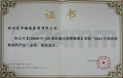 會上,與會人員主要圍繞會議主題進(jìn)行技術(shù)、市場、創(chuàng)新、發(fā)展等廣泛交流。會議期間,評比并頒發(fā)了2015中國農(nóng)機(jī)零部件46項(xiàng)金獎產(chǎn)品和25項(xiàng)創(chuàng)新獎產(chǎn)品。東華申報的C2060F77_OR和C2062H_ORSDF1密封圈鏈條經(jīng)久保田、福田雷沃等知名整機(jī)企業(yè)的推薦,專家委員會最終評審決定,對 東華申報的這兩款密封圈鏈條分別授予金獎和創(chuàng)新獎。這個獎項(xiàng)是目前農(nóng)機(jī)鏈條企業(yè)的最高榮譽(yù),體現(xiàn)了東華農(nóng)機(jī)鏈條處于國內(nèi)同行領(lǐng)先水平,得到廣大農(nóng)業(yè)主機(jī)單位的贊譽(yù)和認(rèn)可。東華生產(chǎn)的農(nóng)機(jī)鏈條也暢銷國際市場,與CLASS、紐荷蘭等世界500強(qiáng)企業(yè)配套。