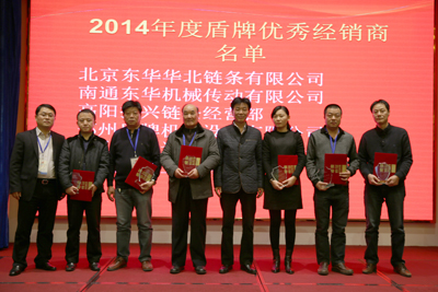 最后,內(nèi)銷公司總經(jīng)理戴迪漢宣讀了東華19名2014年度“優(yōu)秀經(jīng)銷商”名單;盾牌公司總經(jīng)理錢文孝宣讀了盾牌6名2014年度“優(yōu)秀經(jīng)銷商”名單。董事長宣碧華向獲獎經(jīng)銷商頒發(fā)了獎杯和證書,并合影留戀。