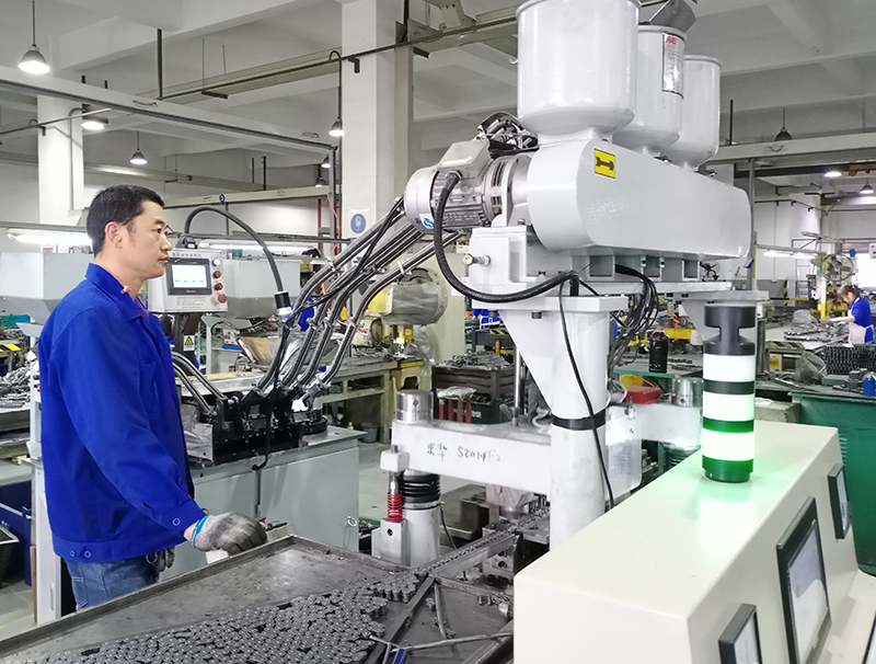 東華積極應對訂單爆發式增長,為滿足客戶交貨需求,今年一季度,公司技改設備投入已經超過了去年全年,達到了2000多萬元。如農機鏈事業部不斷加大技術革新,對ZGS外附板、S52外附板、A55外附板等落料壓彎一體化模具開發、投入100HHA成條機裝配設備代替人工裝配、組建CA、ZGS和A960系列裝配流水線代替原來的人工榔頭裝配,大大提升了生產效率,以滿足客戶的交貨需求。