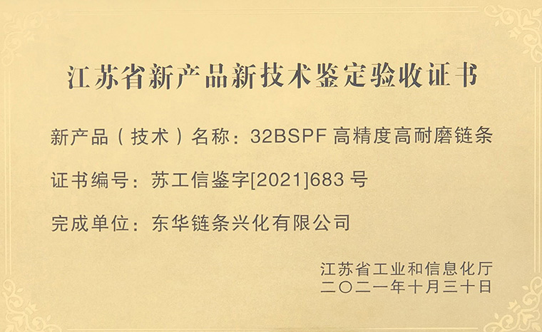 日前, 東華鏈條興化公司收到江蘇省工業和信息化廳頒發的江蘇省省級工業新產品新技術驗收證書,公司研制的“32BSPF高精度高耐磨鏈條”產品通過省級工業新產品鑒定。